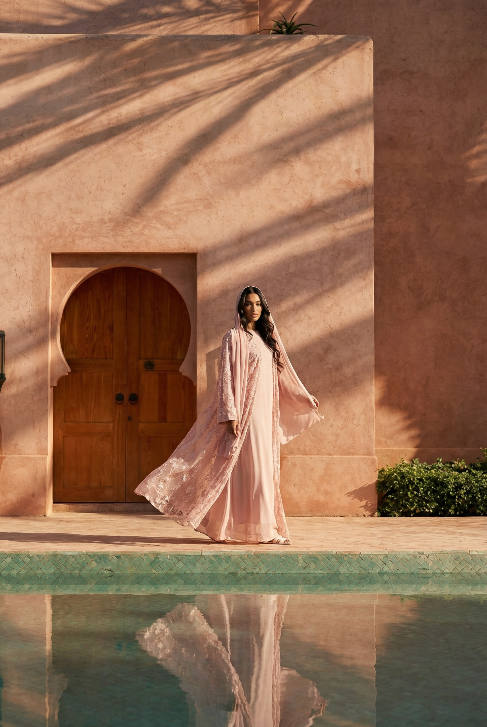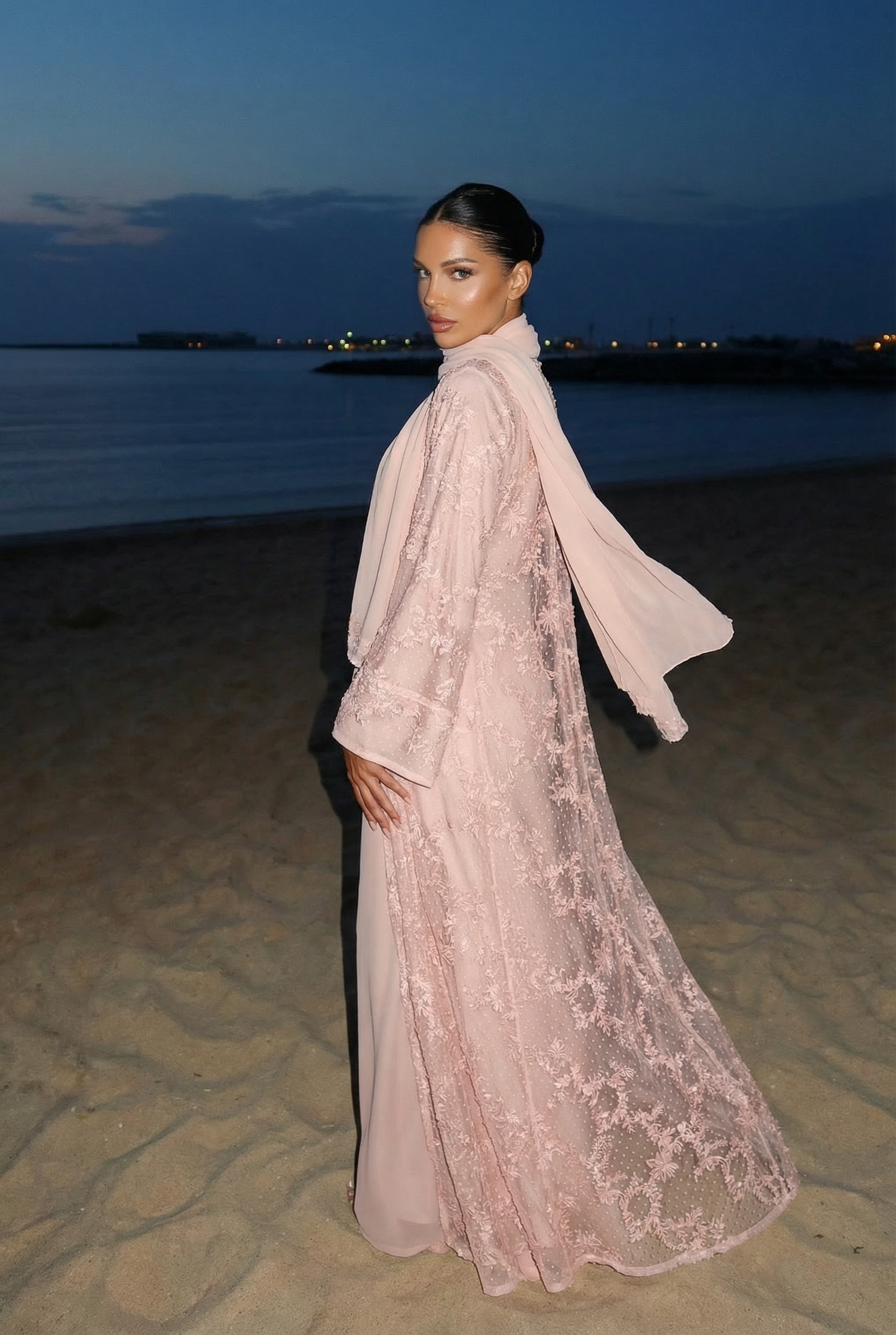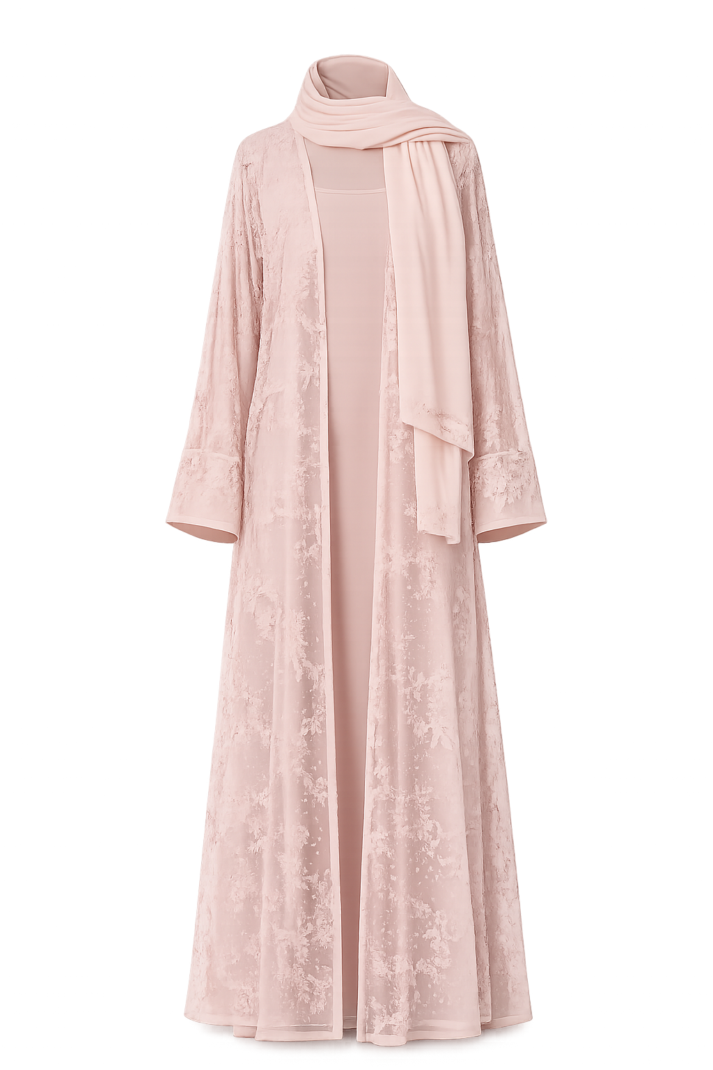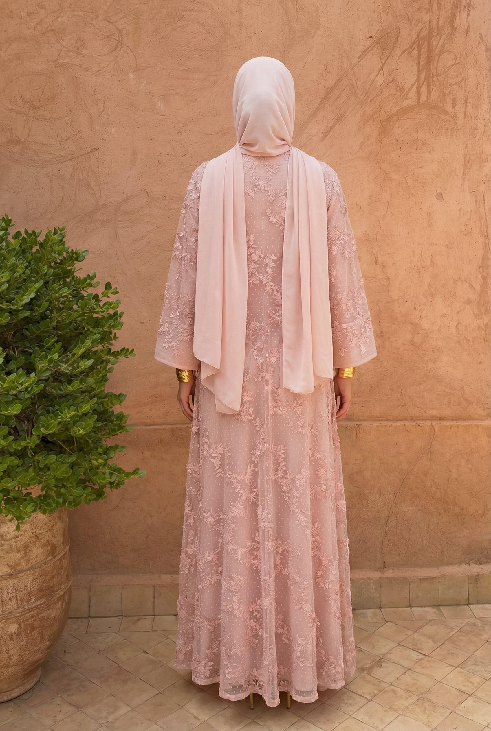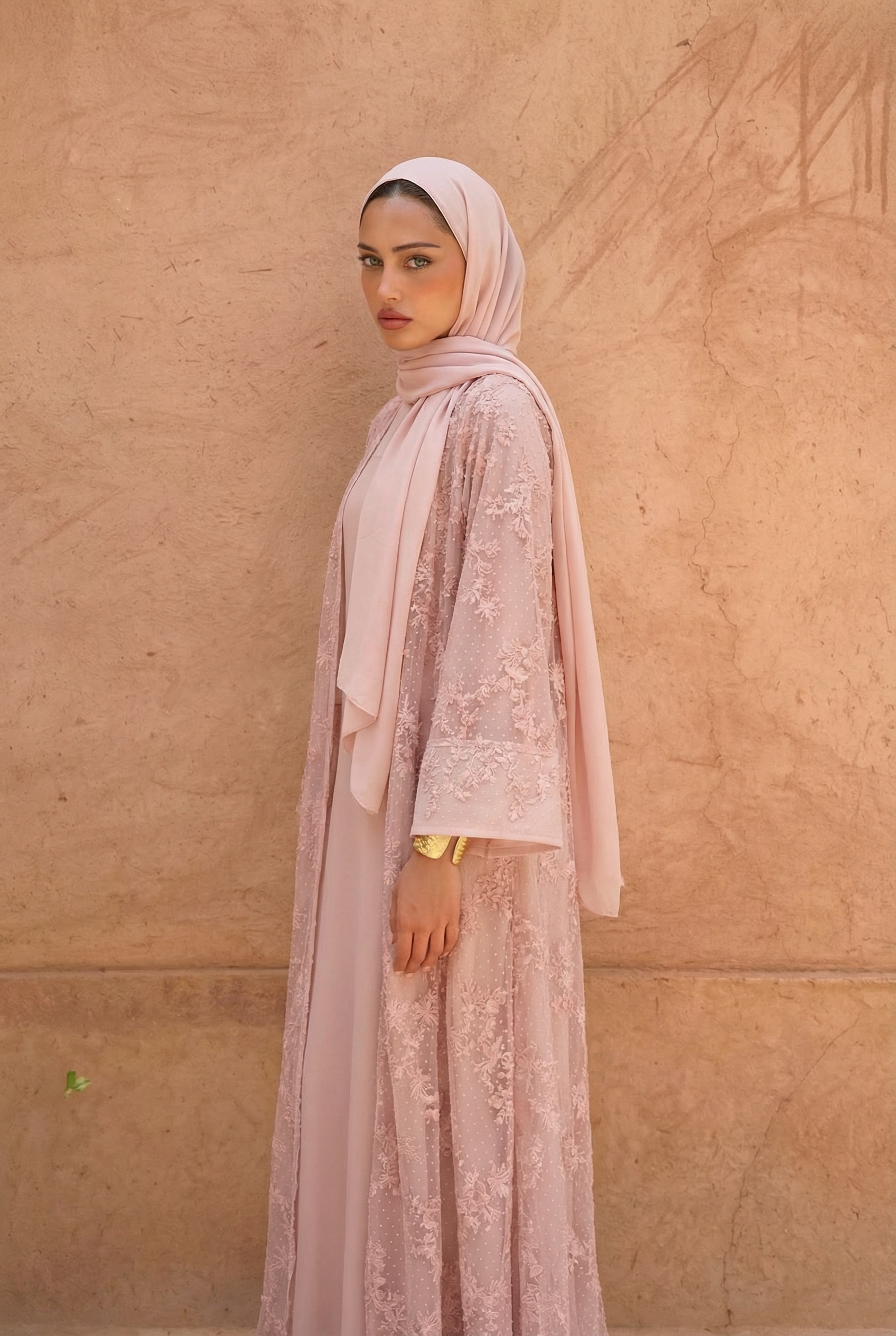 L’abaya se distingue par sa mousseline subtilement texturée, ornée de motifs floraux délicats et de broderies légères qui apportent relief et douceur sans alourdir la silhouette. Sa transparence maîtrisée laisse apparaître la robe intérieure ton sur ton, créant un jeu de superposition élégant et féminin.