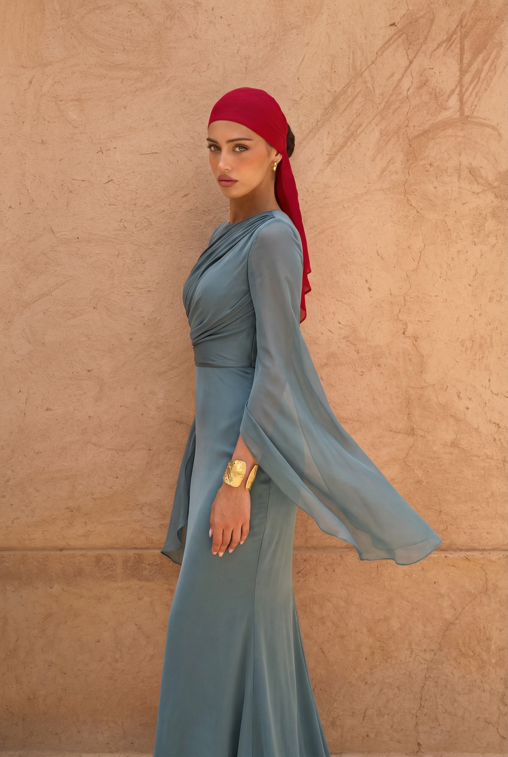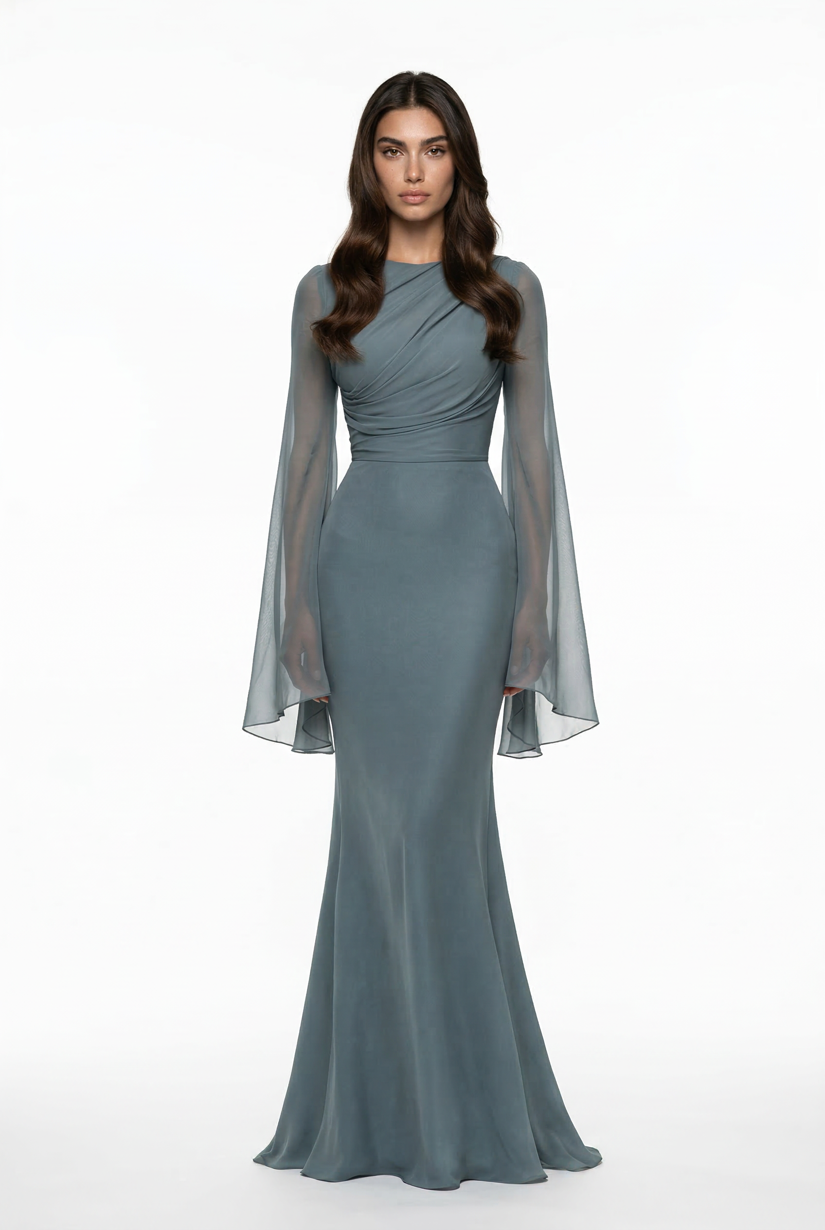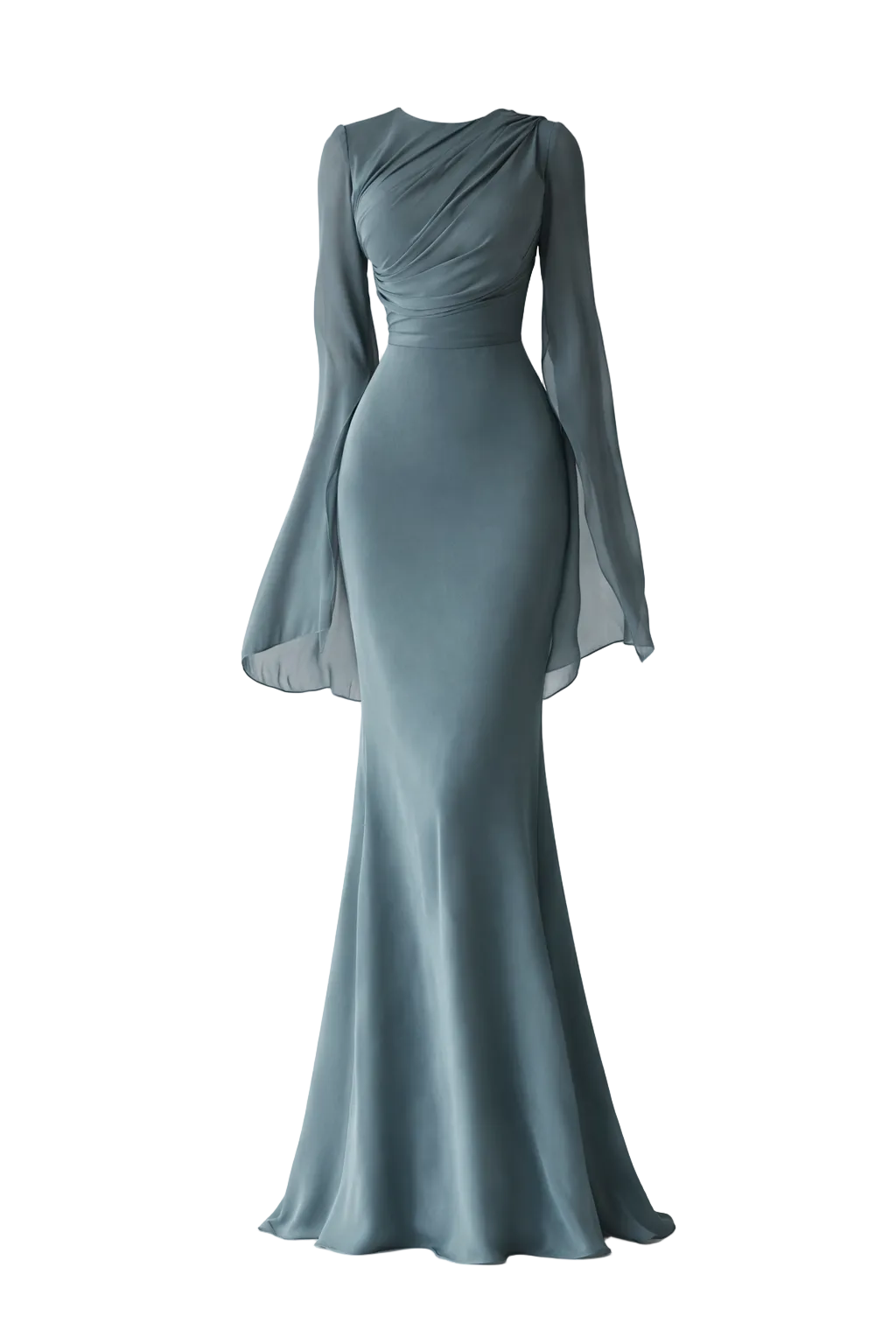 Confectionnée dans un tissu satinée légèrement extensible, elle épouse naturellement les courbes du corps avant de s’évaser subtilement vers le bas pour une silhouette longue et élancée. Les manches longues en voile léger apportent mouvement et légèreté, donnant à la robe une dimension aérienne et sophistiquée.