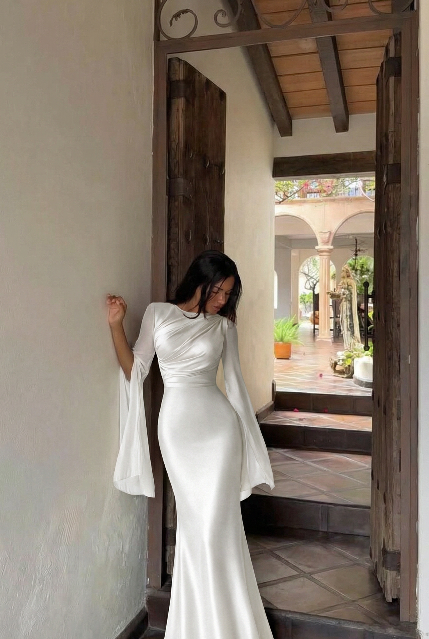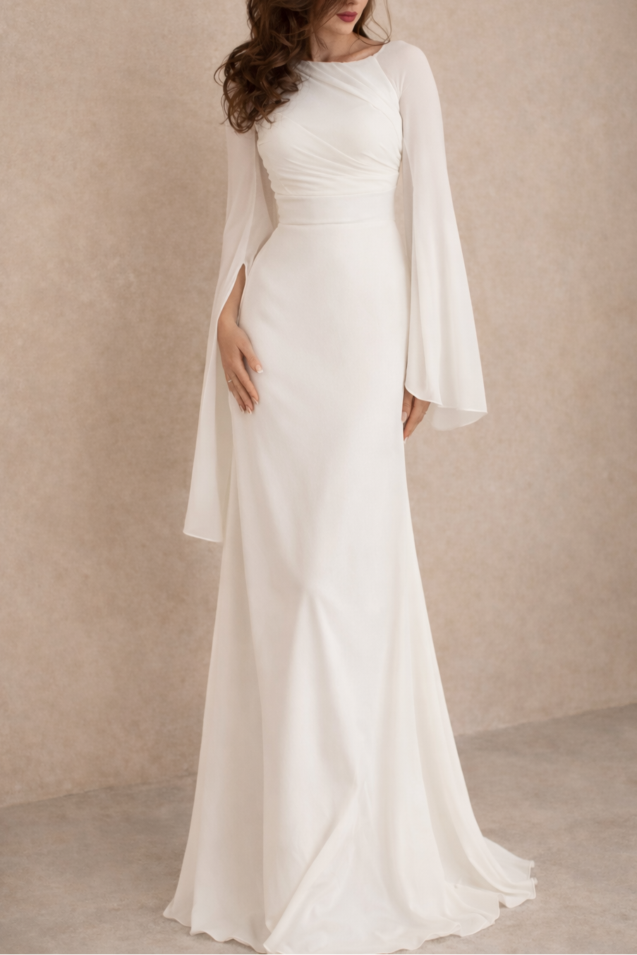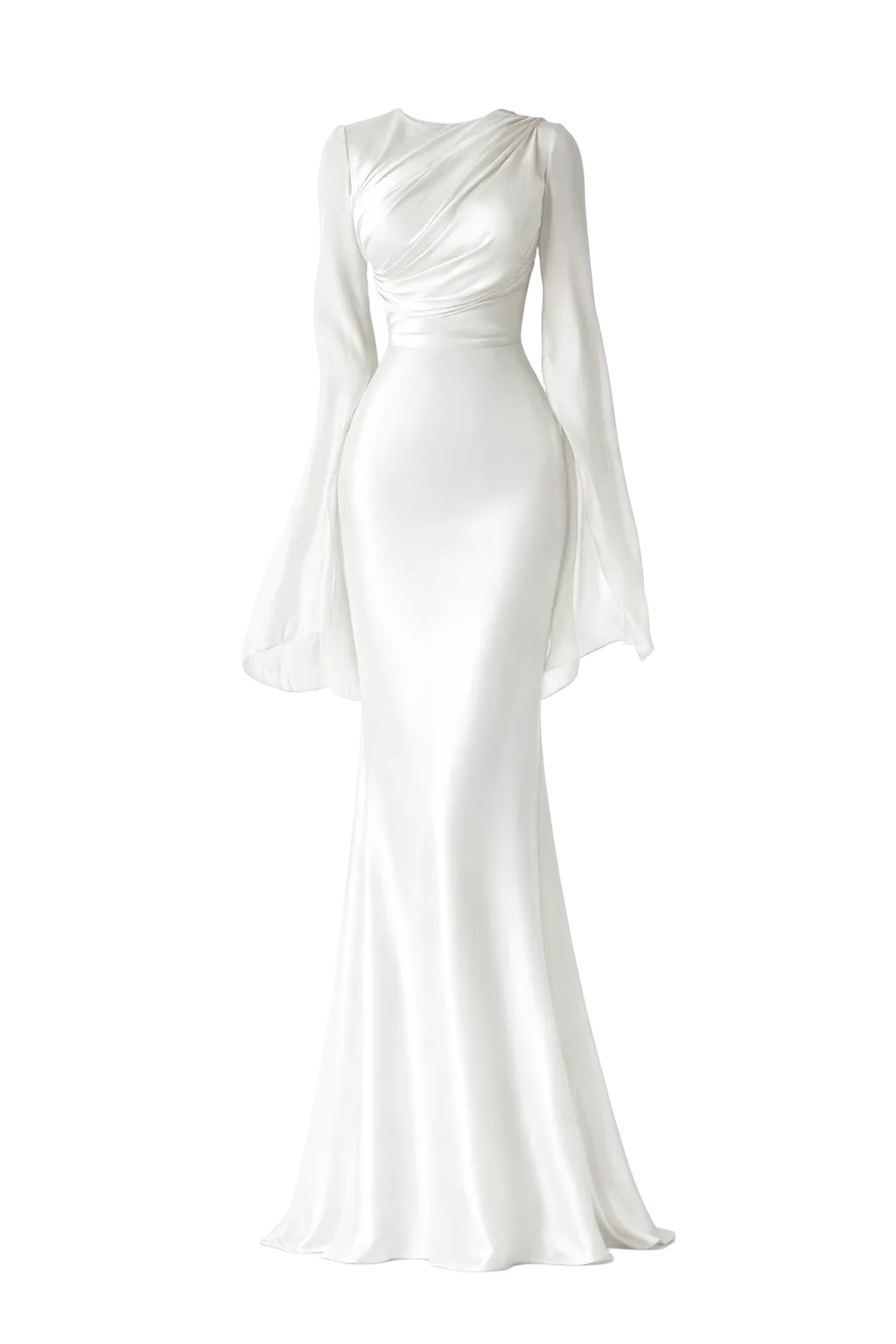 Confectionnée dans un tissu satinée légèrement extensible, elle épouse naturellement les courbes du corps avant de s’évaser subtilement vers le bas pour une silhouette longue et élancée. Les manches longues en voile léger apportent mouvement et légèreté, donnant à la robe une dimension aérienne et sophistiquée.