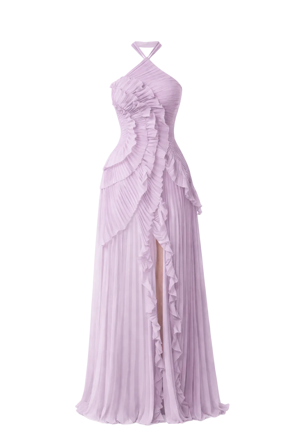 Son drapé travaillé crée un mouvement fluide et léger, tandis que la fente subtile sur la jambe apporte une touche sensuelle et moderne. Les fines bretelles et le décolleté croisé soulignent délicatement les épaules pour un rendu à la fois chic et intemporel.
