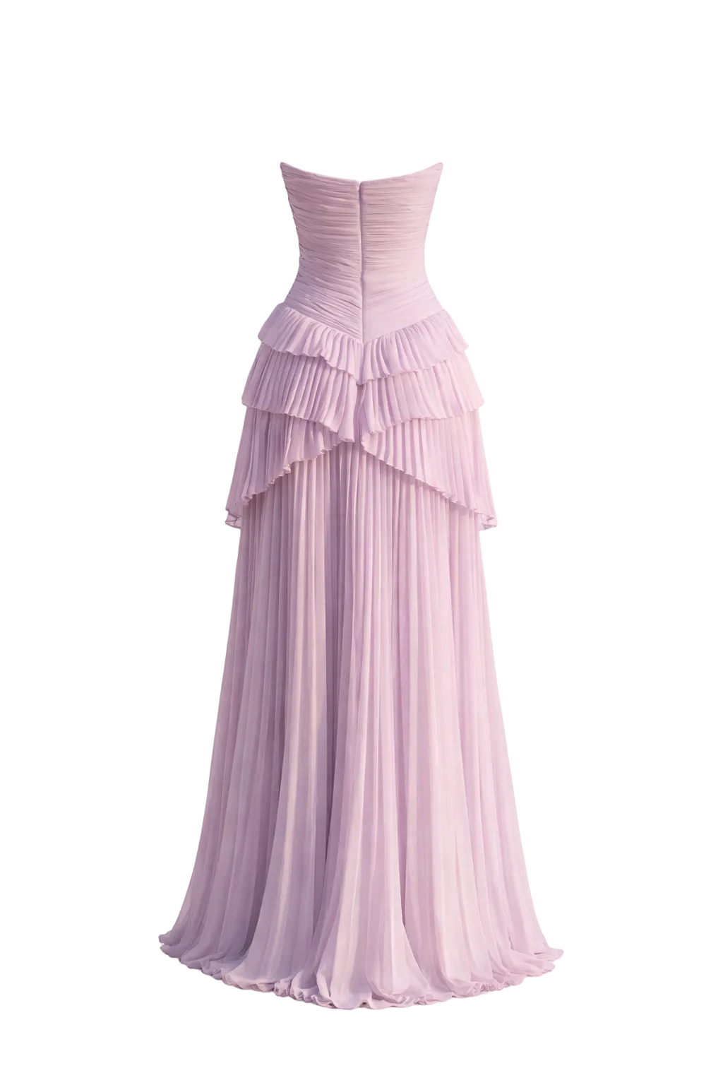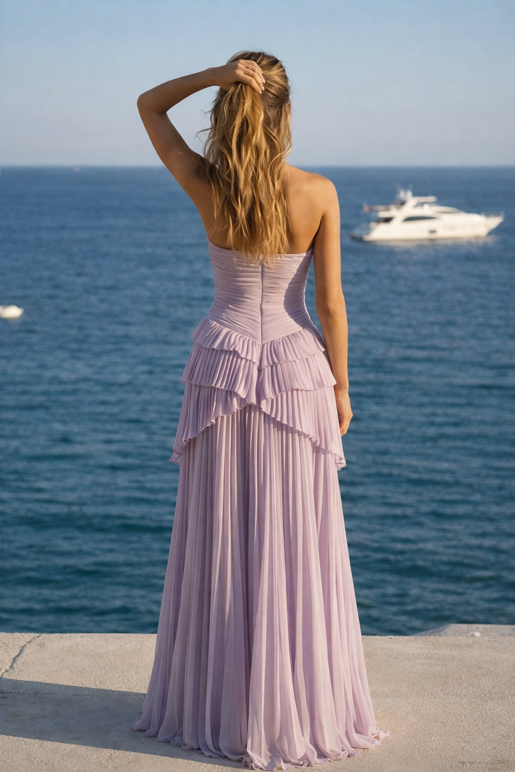 • Drapé et volants structurés sur le buste