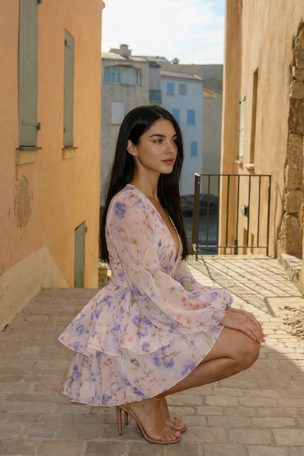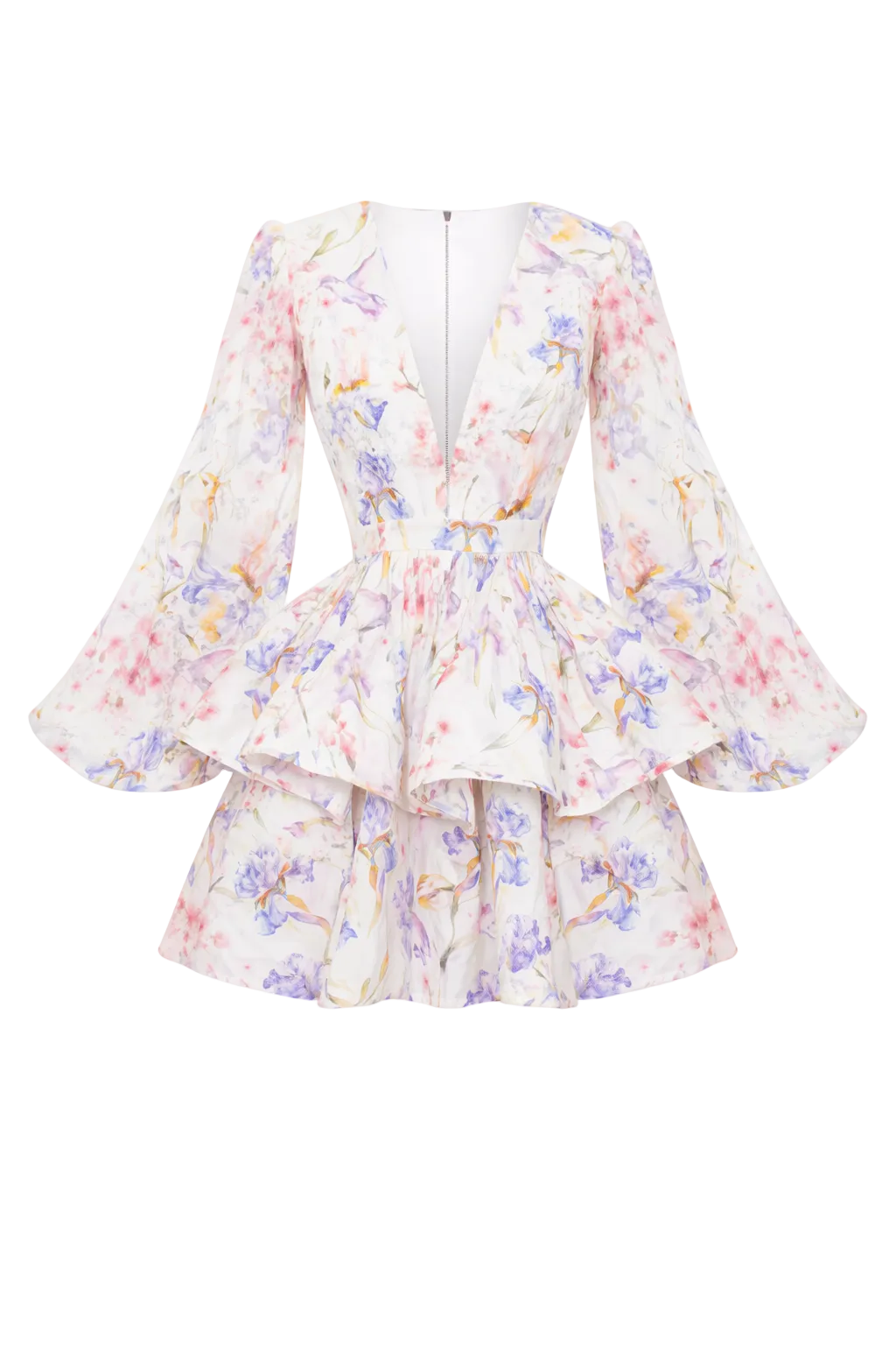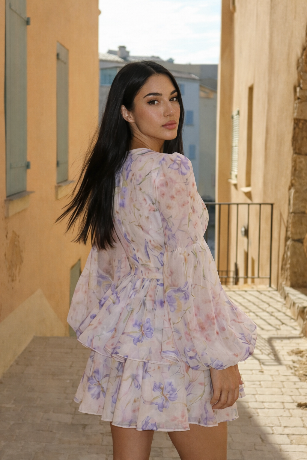 Son décolleté en V plongeant apporte une touche de sensualité tout en restant raffiné, tandis que les manches longues évasées en tissu léger ajoutent du volume et de la légèreté à la silhouette. L’imprimé floral pastel aux nuances de violet, rose et jaune illumine la robe et en fait une pièce parfaite pour les journées ensoleillées comme pour les soirées d’été.