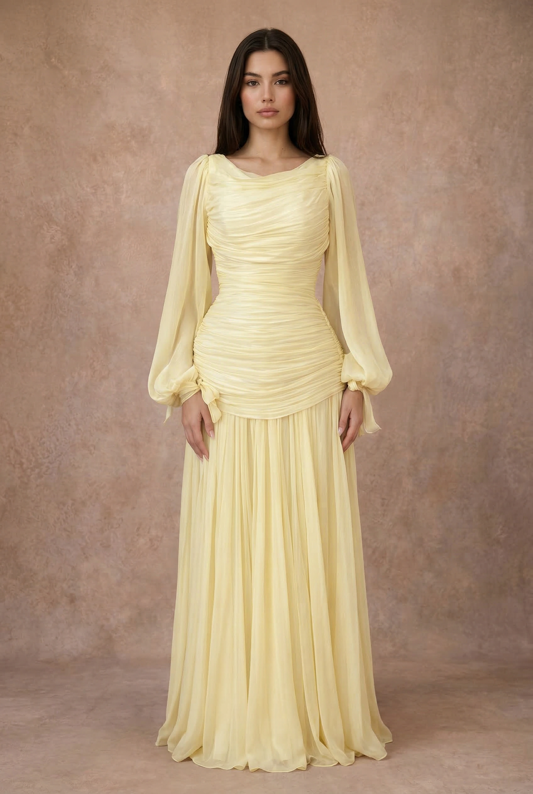 Le modèle NOUR est une robe longue élégante au drapé délicat, pensée pour sublimer la silhouette avec raffinement.
