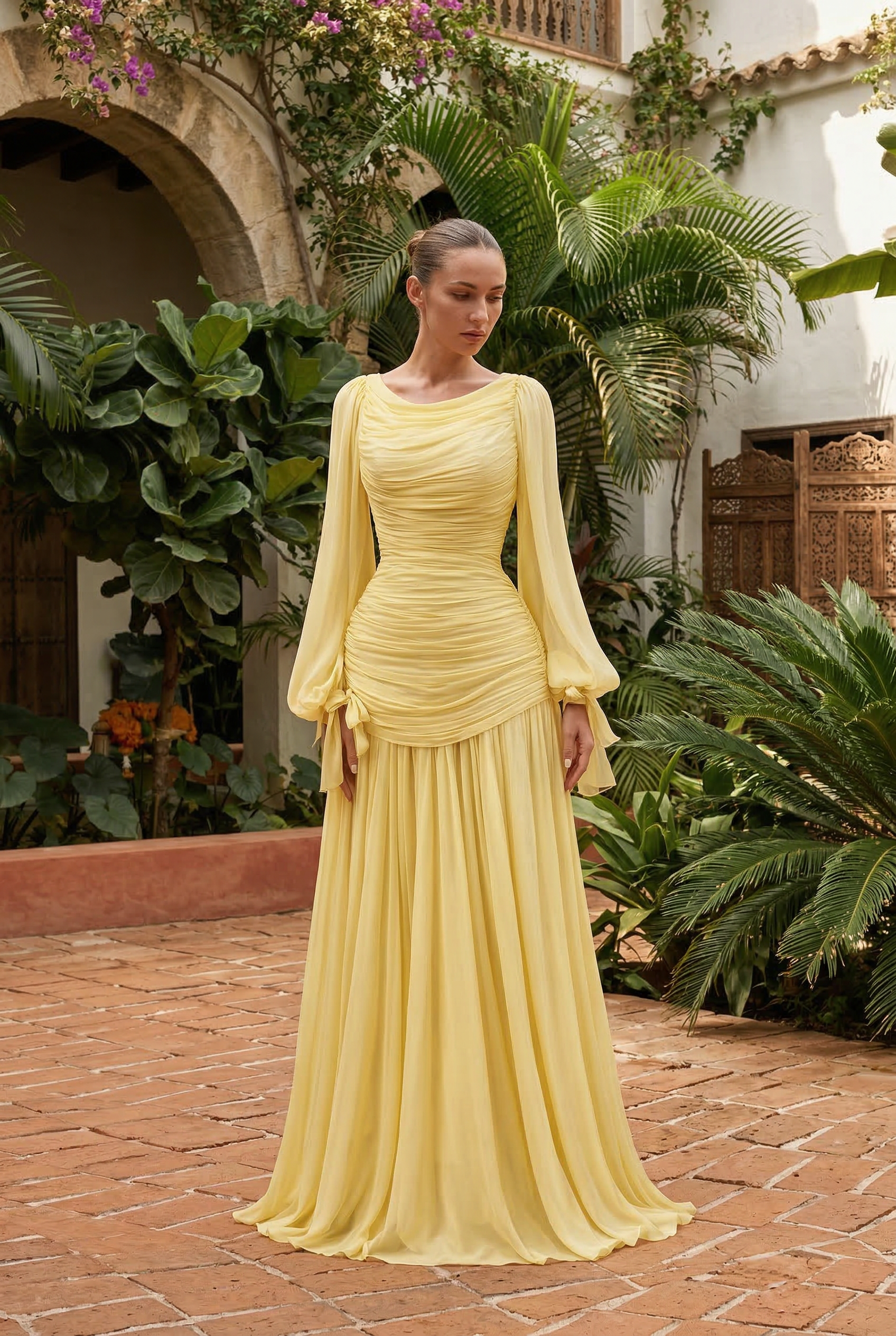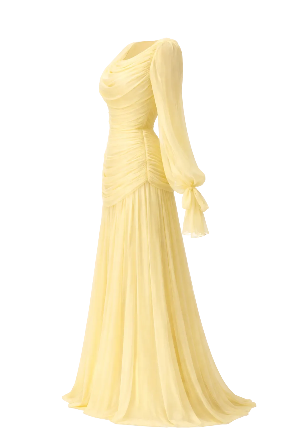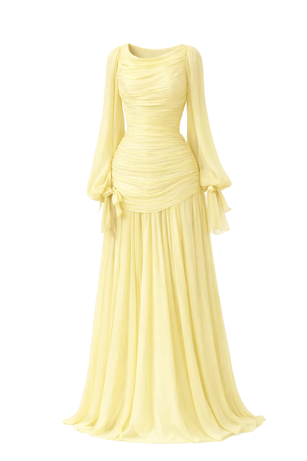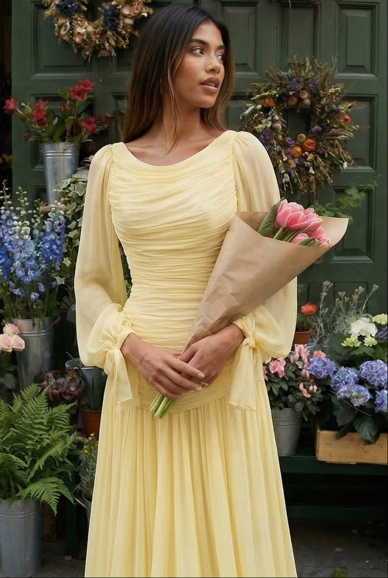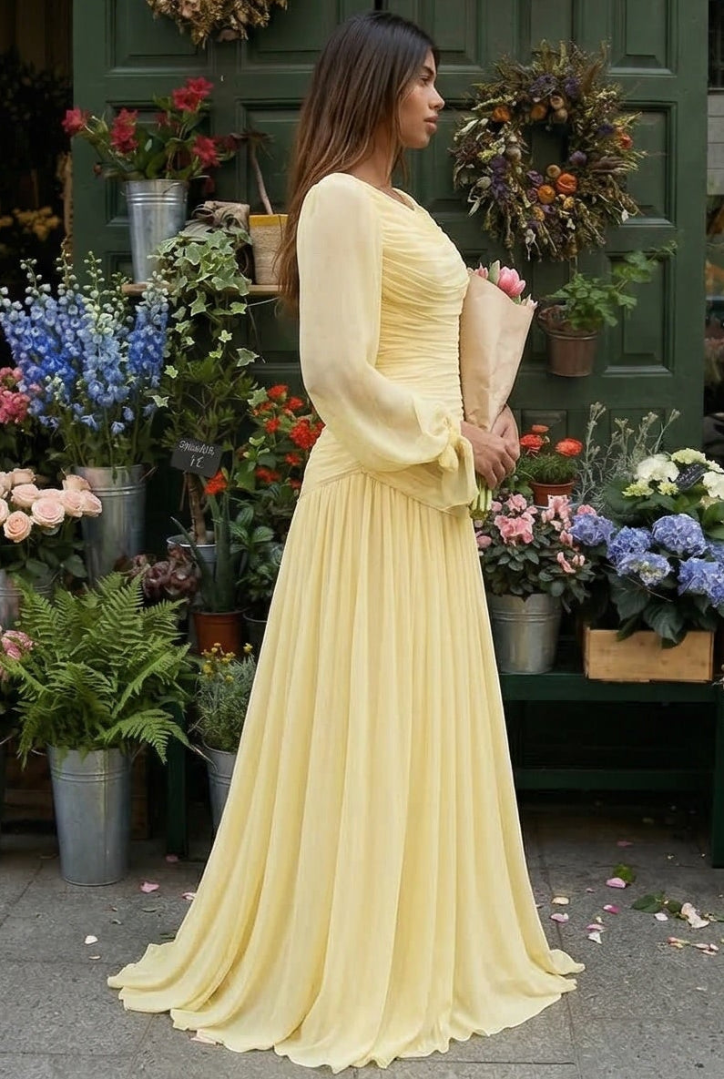 Les manches longues de style lanterne, fluides et légèrement volumineuses, se terminent par un lien délicat au poignet qui accentue la légèreté du mouvement.