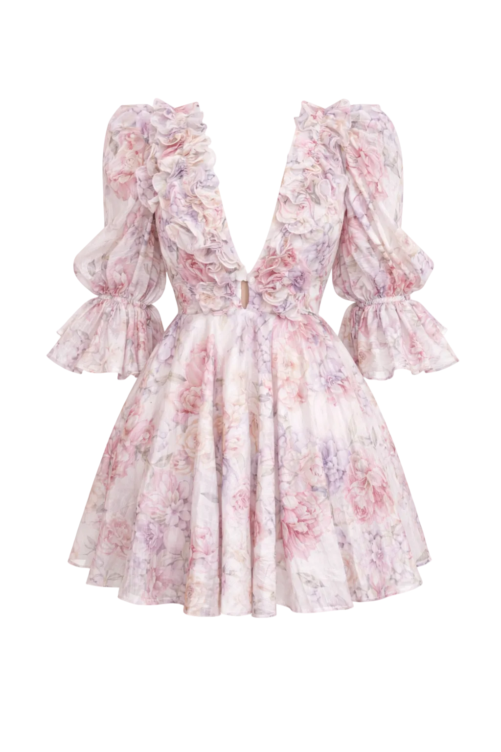 Le décolleté plongeant orné de volants apporte une touche sensuelle et sophistiquée, tandis que les manches bouffantes à finition volantée donnent du volume et de la douceur à la silhouette. L’imprimé floral aux nuances de rose, lavande et beige crée un rendu délicat et lumineux, parfait pour les journées ensoleillées comme pour les soirées d’été.